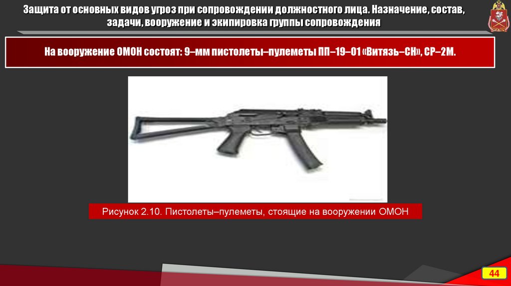 На вооружение ОМОН состоят: 9–мм пистолеты–пулеметы ПП–19–01 «Витязь–СН», СР–2М.