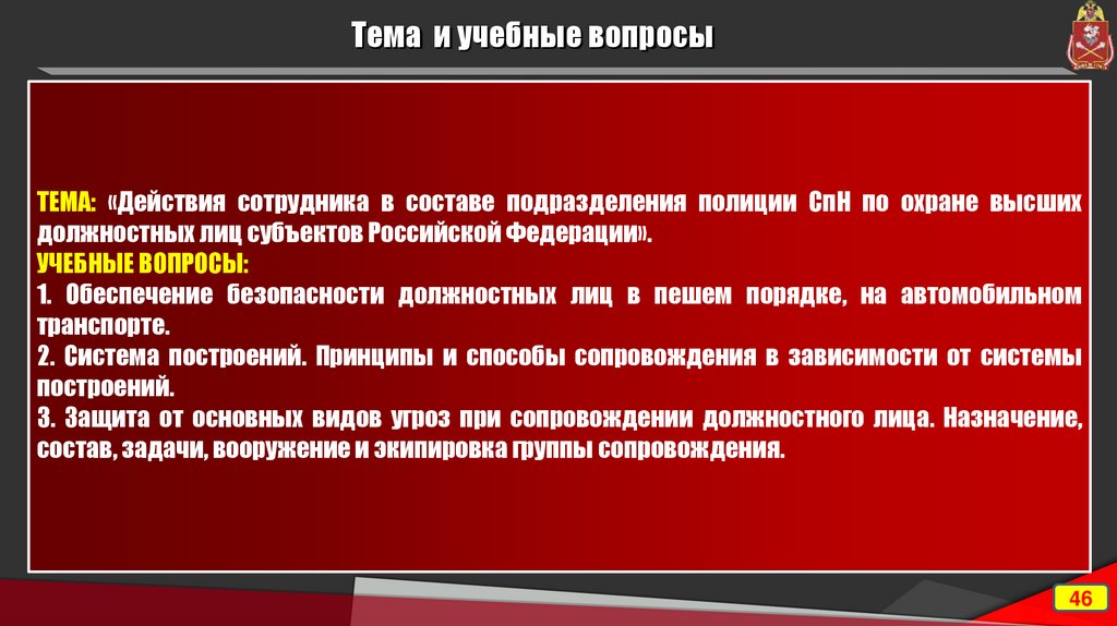 Тема и учебные вопросыТЕМА: «Действия сотрудника в составе подразделения полиции СпН по охране высших