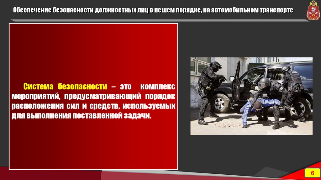 Обеспечение безопасности должностных лиц в пешем порядке, на автомобильном транспортеСистема безопасности – это комплекс
