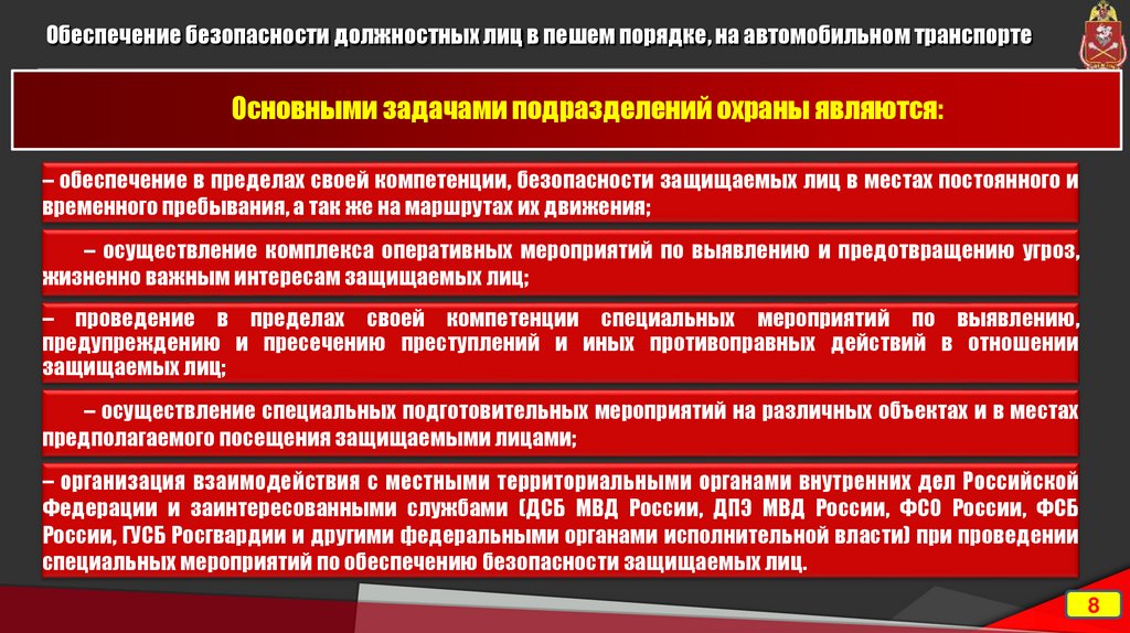 Обеспечение безопасности должностных лиц в пешем порядке, на автомобильном транспортеОсновными задачами подразделений охраны являются: