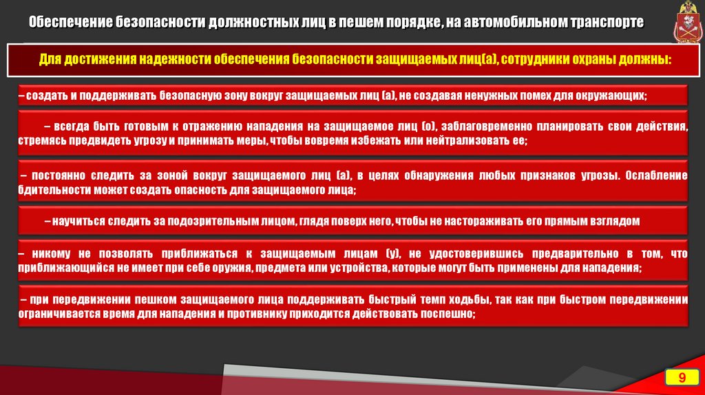 Обеспечение безопасности должностных лиц в пешем порядке, на автомобильном транспортеДля достижения надежности обеспечения безопасности защищаемых лиц(а), сотрудники охраны должны: