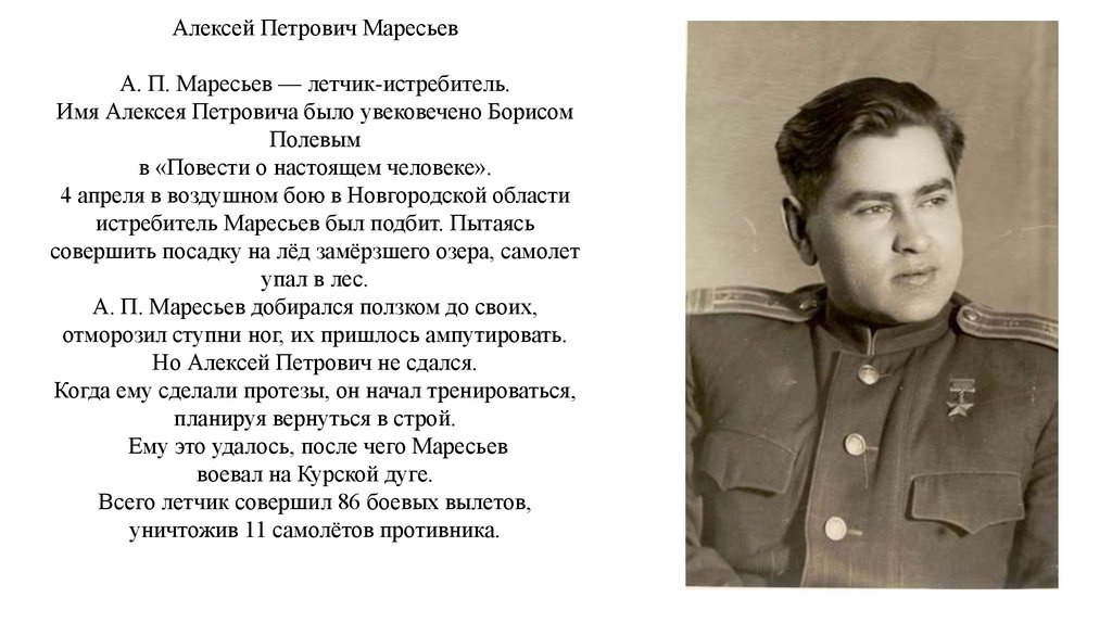 Алексей Петрович МаресьевА. П. Маресьев — летчик-истребитель.