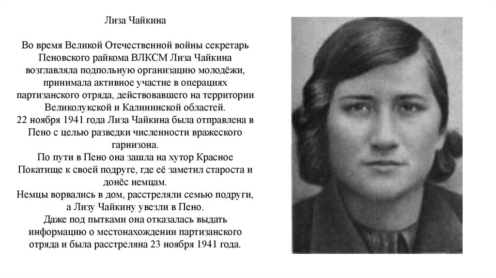 Лиза ЧайкинаВо время Великой Отечественной войны секретарь