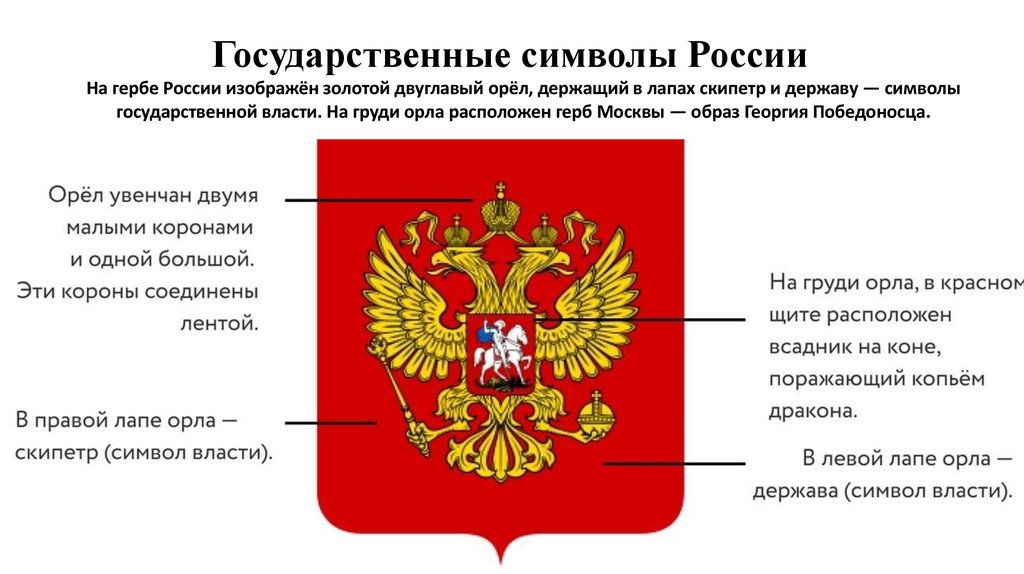Государственные символы РоссииНа гербе России изображён золотой двуглавый орёл, держащий в лапах скипетр и державу — символы