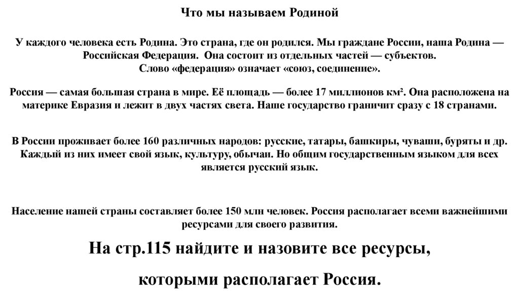 Население нашей страны составляет более 150 млн человек. Россия располагает всеми важнейшими