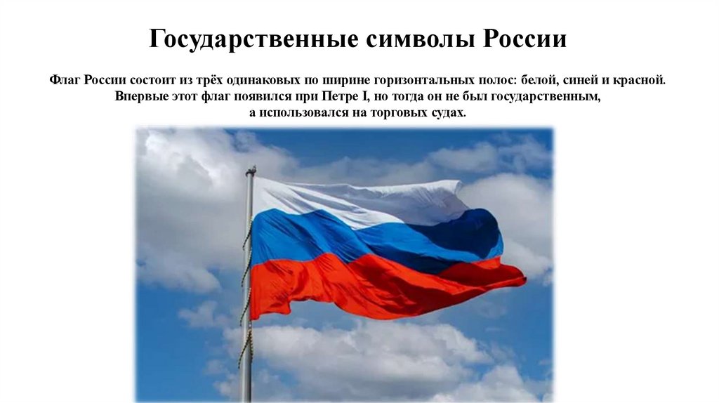 Государственные символы РоссииФлаг России состоит из трёх одинаковых по ширине горизонтальных полос: белой, синей и красной.