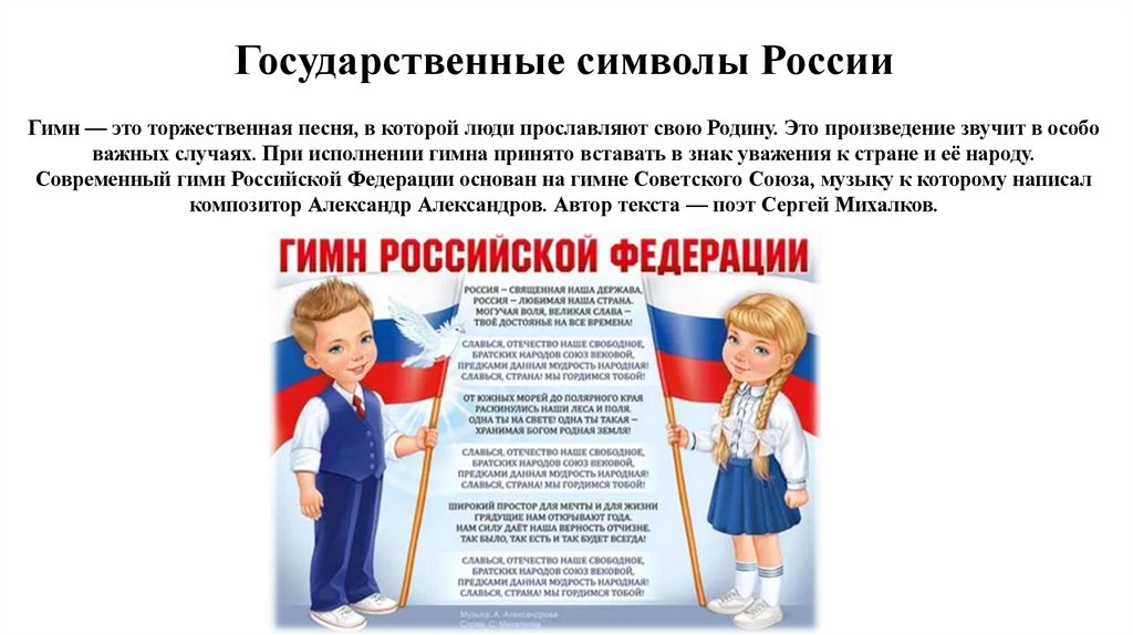 Государственные символы РоссииГимн — это торжественная песня, в которой люди прославляют свою Родину. Это произведение звучит в особо