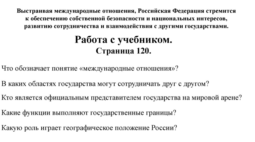 Выстраивая международные отношения, Российская Федерация стремитсяк обеспечению собственной безопасности и национальных интересов,