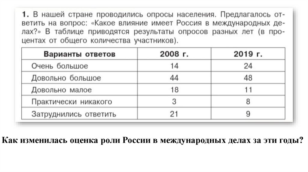 Как изменилась оценка роли России в международных делах за эти годы?25.