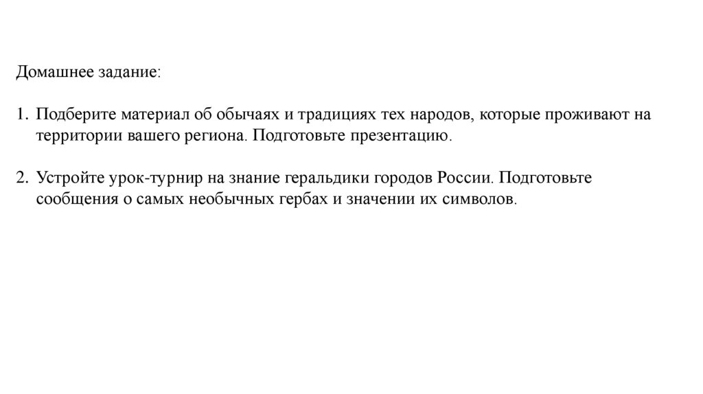 Домашнее задание:1. Подберите материал об обычаях и традициях тех народов, которые проживают на