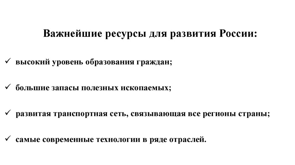Важнейшие ресурсы для развития России:высокий уровень образования граждан;