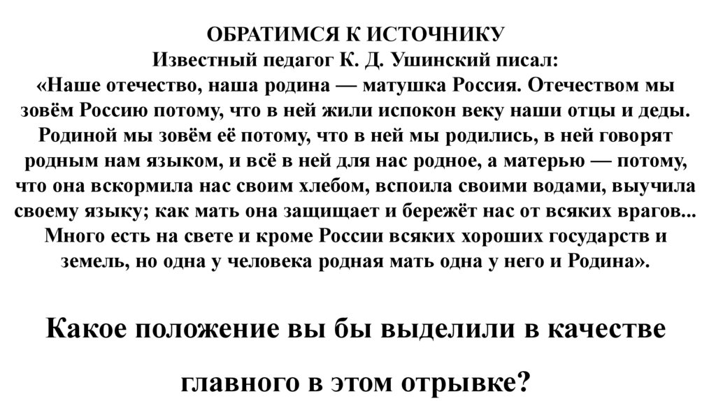 «Наше отечество, наша родина — матушка Россия. Отечеством мы