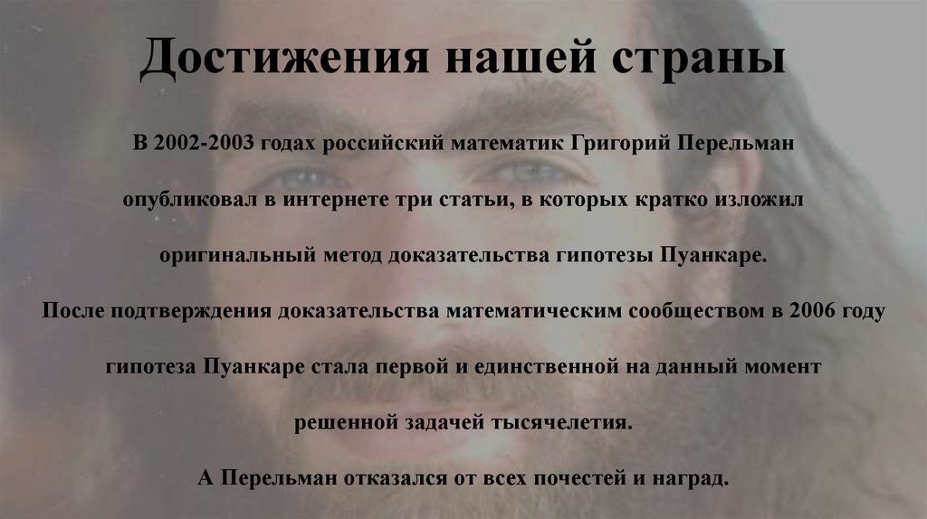 Достижения нашей страныВ 2002-2003 годах российский математик Григорий Перельман