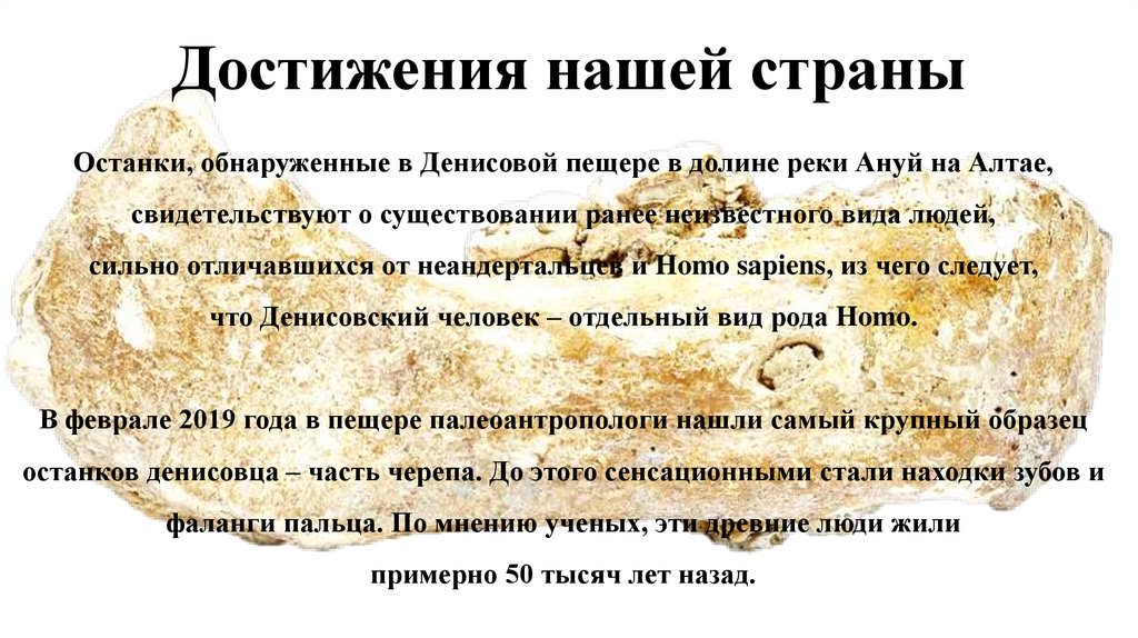 Достижения нашей страныОстанки, обнаруженные в Денисовой пещере в долине реки Ануй на Алтае,