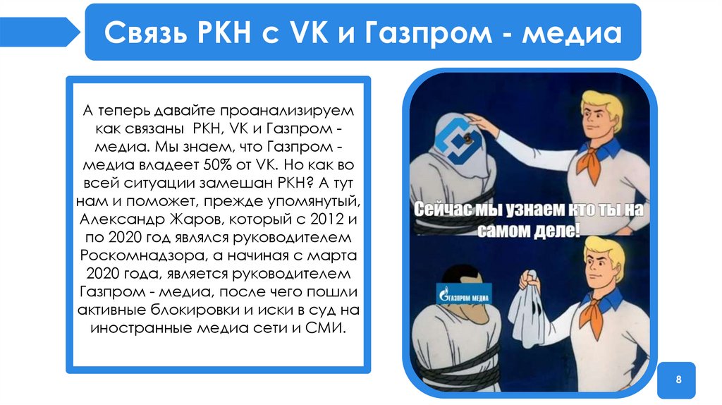 как связаны РКН, VK и Газпром медиа. Мы знаем, что Газпром медиа владеет 50% от VK. Но как во