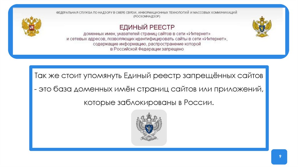 Так же стоит упомянуть Единый реестр запрещённых сайтов- это база доменных имён страниц сайтов или приложений,