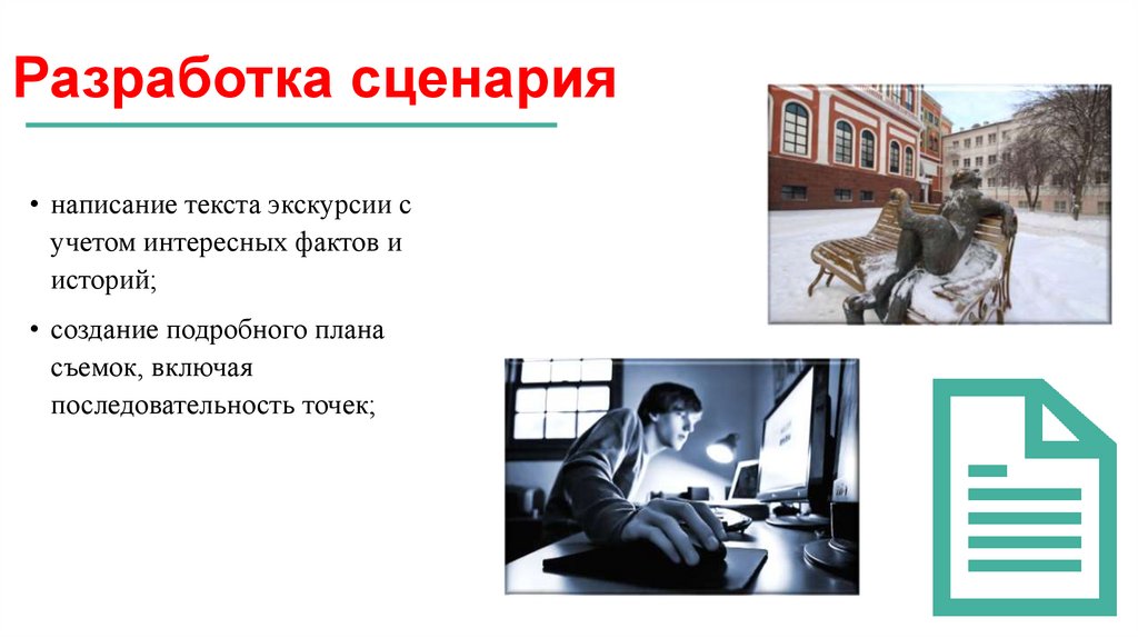 Разработка сценария• написание текста экскурсии с