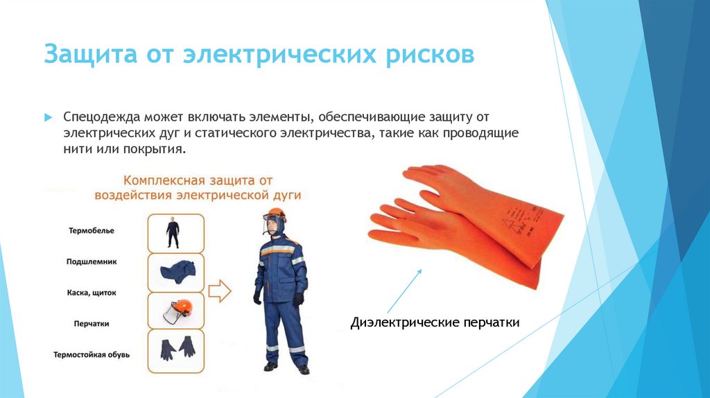 Защита от электрических рисковСпецодежда может включать элементы, обеспечивающие защиту от
