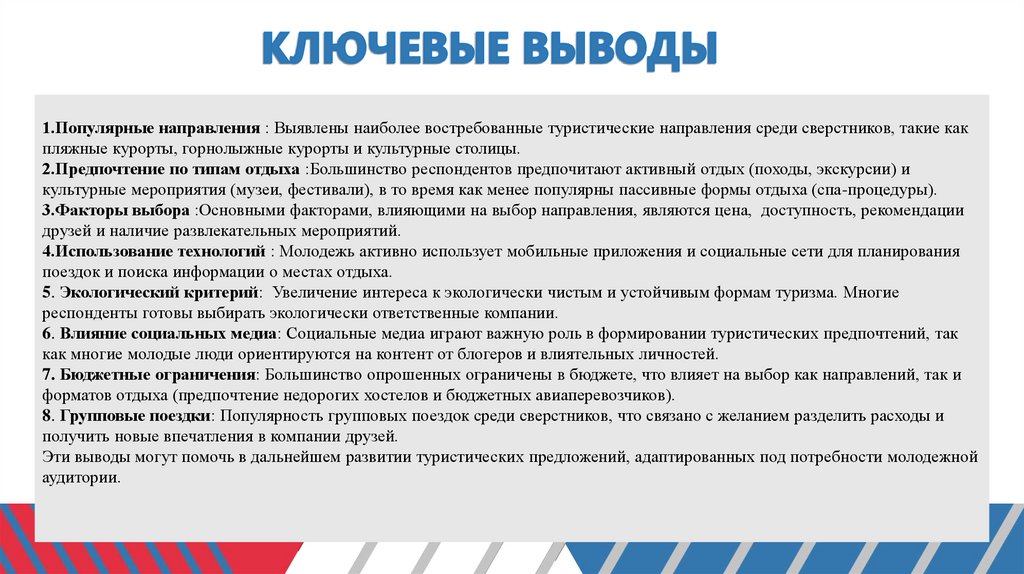 Эти выводы могут помочь в дальнейшем развитии туристических предложений, адаптированных под потребности молодежной
