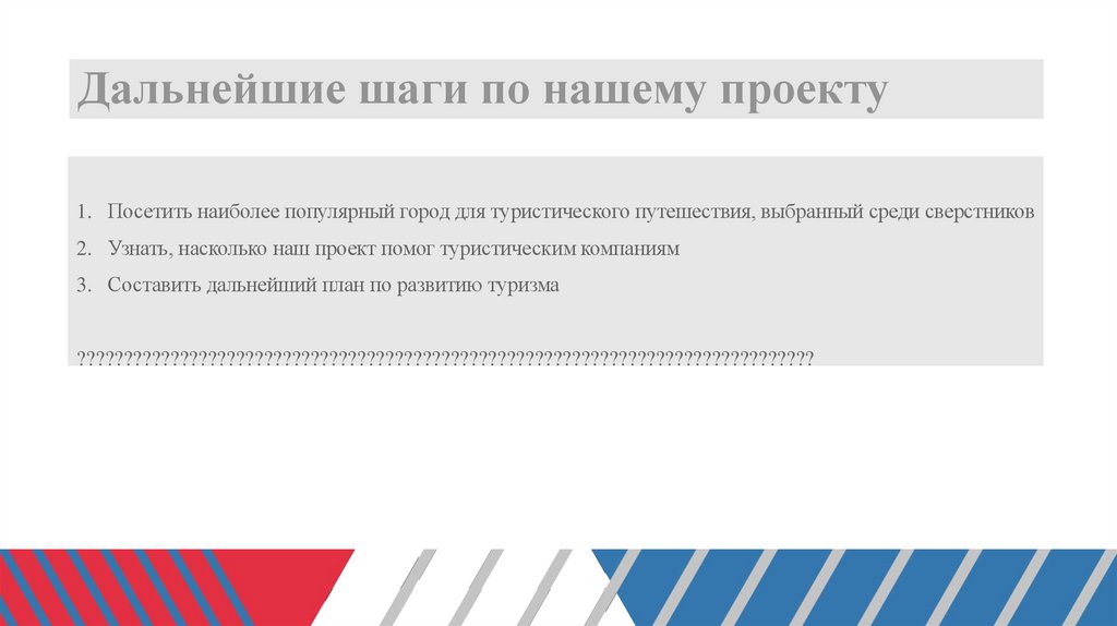 Дальнейшие шаги по нашему проекту1. Посетить наиболее популярный город для туристического путешествия, выбранный среди сверстников