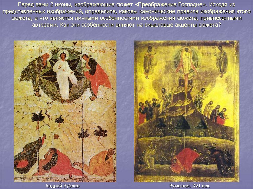 Перед вами 2 иконы, изображающие сюжет «Преображение Господне». Исходя изпредставленных изображений, определите, каковы канонические правила изображения этого