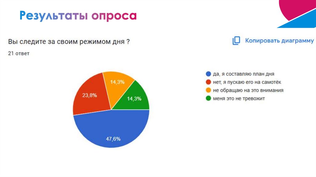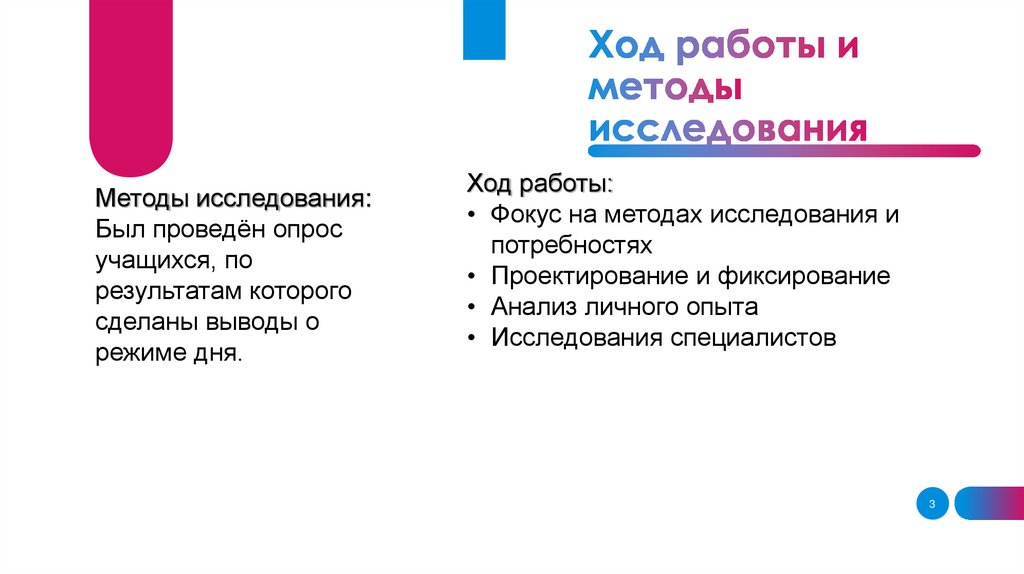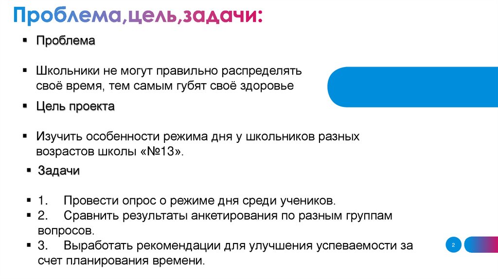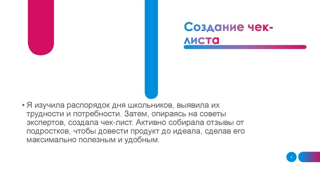 • Я изучила распорядок дня школьников, выявила ихтрудности и потребности. Затем, опираясь на советы