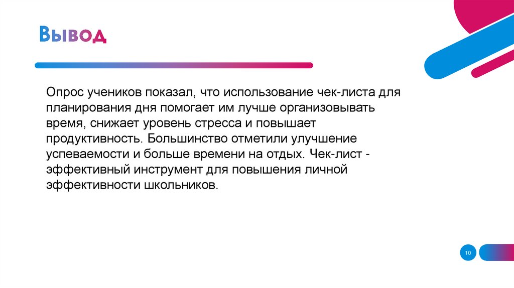 Опрос учеников показал, что использование чек-листа дляпланирования дня помогает им лучше организовывать