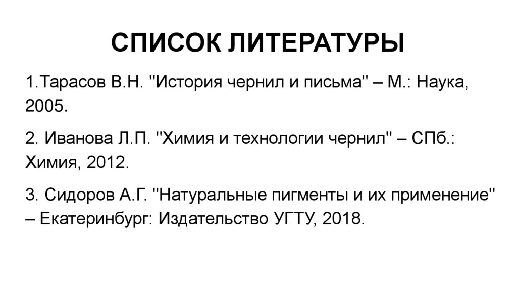 СПИСОК ЛИТЕРАТУРЫ1.Тарасов В.Н. "История чернил и письма" – М.: Наука,