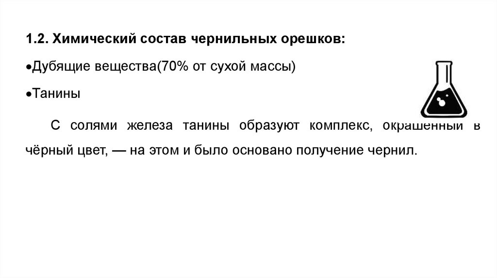 1.2. Химический состав чернильных орешков:Дубящие вещества(70% от сухой массы)