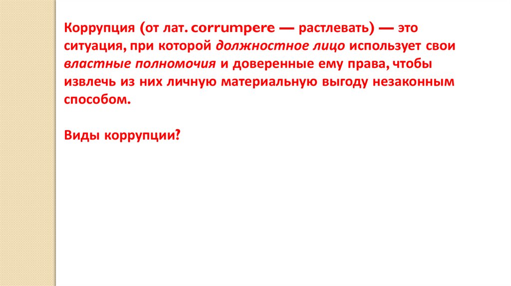 Коррупция (от лат. corrumpere — растлевать) — этоситуация, при которой должностное лицо использует свои