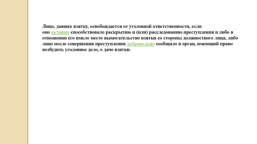 Лицо, давшее взятку, освобождается от уголовной ответственности, еслионо активно способствовало раскрытию и (или) расследованию преступления и либо в