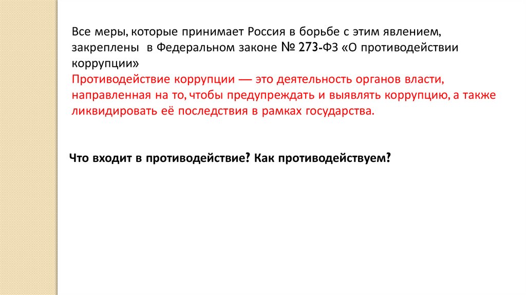 Все меры, которые принимает Россия в борьбе с этим явлением,закреплены в Федеральном законе № 273-ФЗ «О противодействии