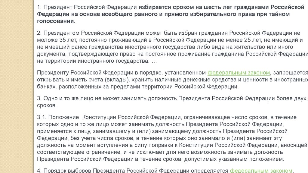 1. Президент Российской Федерации избирается сроком на шесть лет гражданами РоссийскойФедерации на основе всеобщего равного и прямого избирательного права при тайном