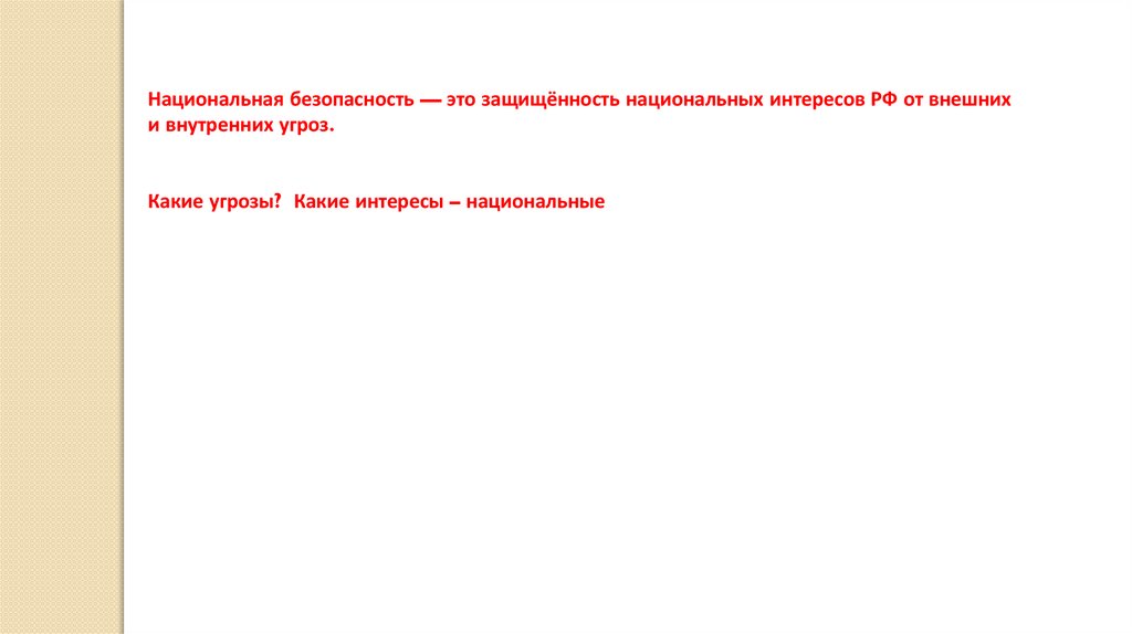 Национальная безопасность — это защищённость национальных интересов РФ от внешнихи внутренних угроз.