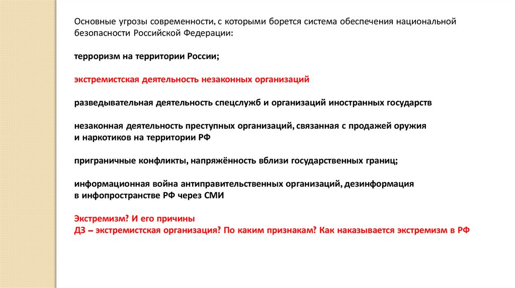 Основные угрозы современности, с которыми борется система обеспечения национальнойбезопасности Российской Федерации: