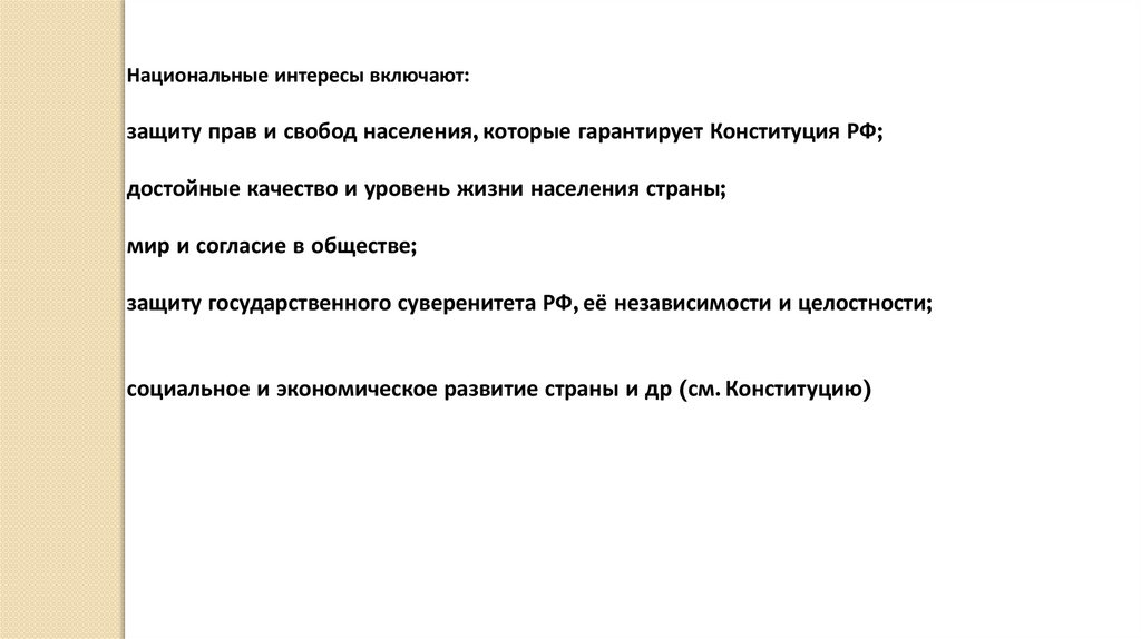 Национальные интересы включают:защиту прав и свобод населения, которые гарантирует Конституция РФ;
