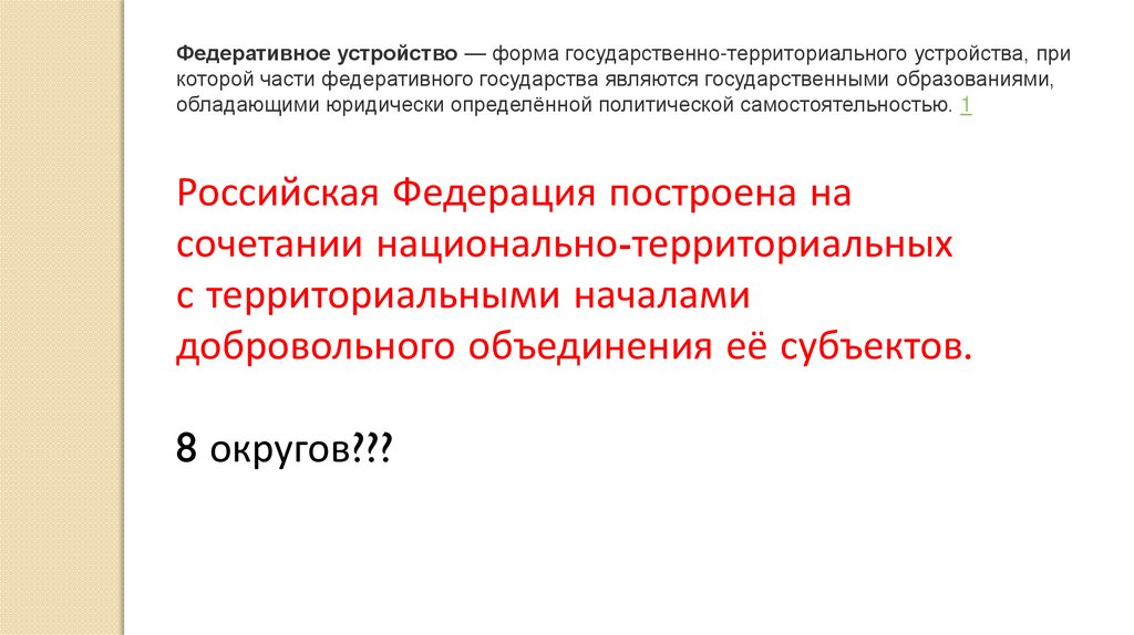 Федеративное устройство — форма государственно-территориального устройства, прикоторой части федеративного государства являются государственными образованиями,