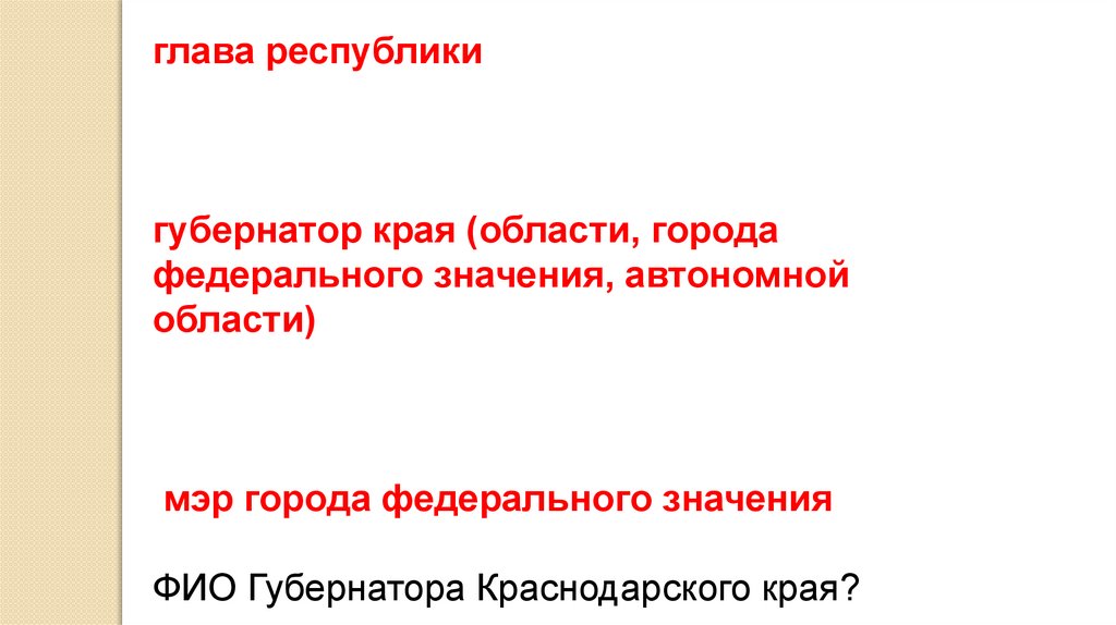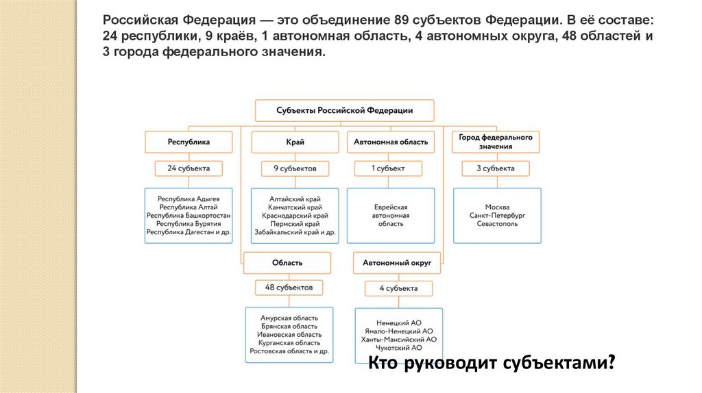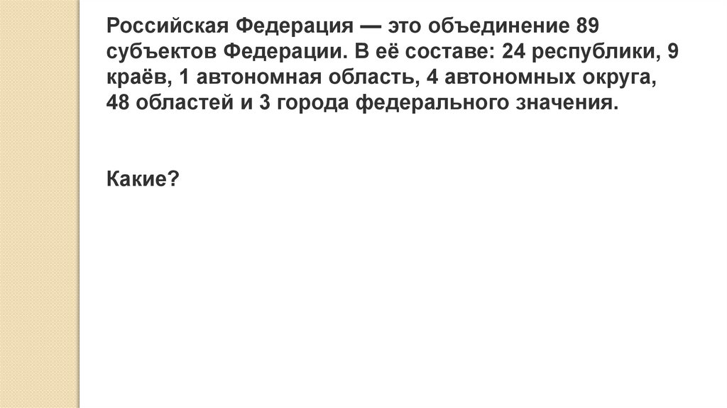 Российская Федерация — это объединение 89 субъектов Федерации. В её составе:24 республики, 9 краёв, 1 автономная область, 4 автономных округа, 48 областей и