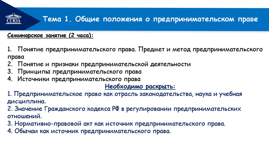 РЕМОНТ Тема 1. Общие положения о предпринимательском правеСеминарское занятие (2 часа):