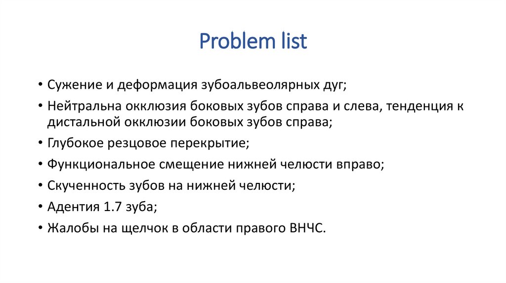 Problem list• Сужение и деформация зубоальвеолярных дуг;