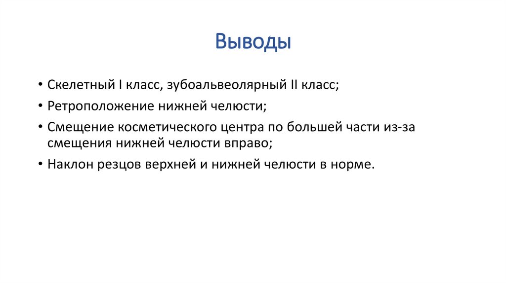 Выводы• Скелетный I класс, зубоальвеолярный II класс;