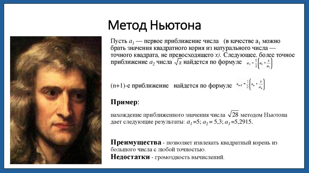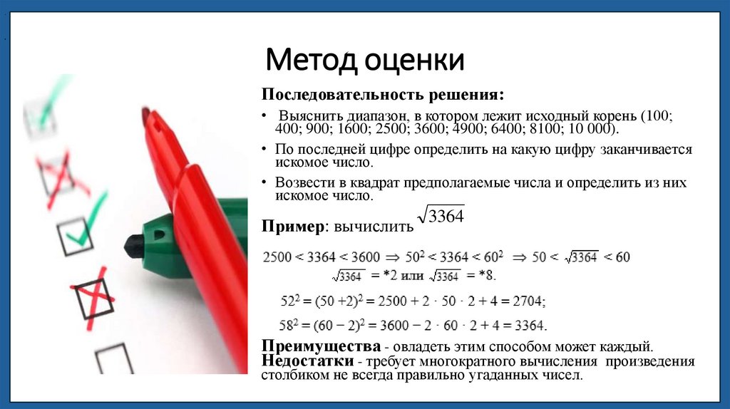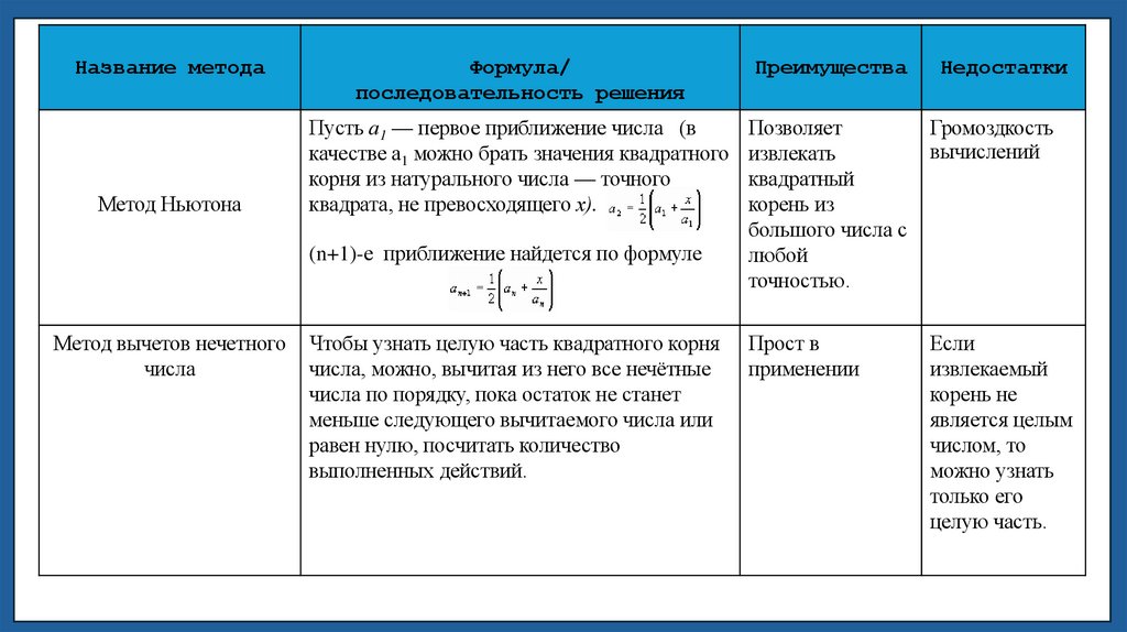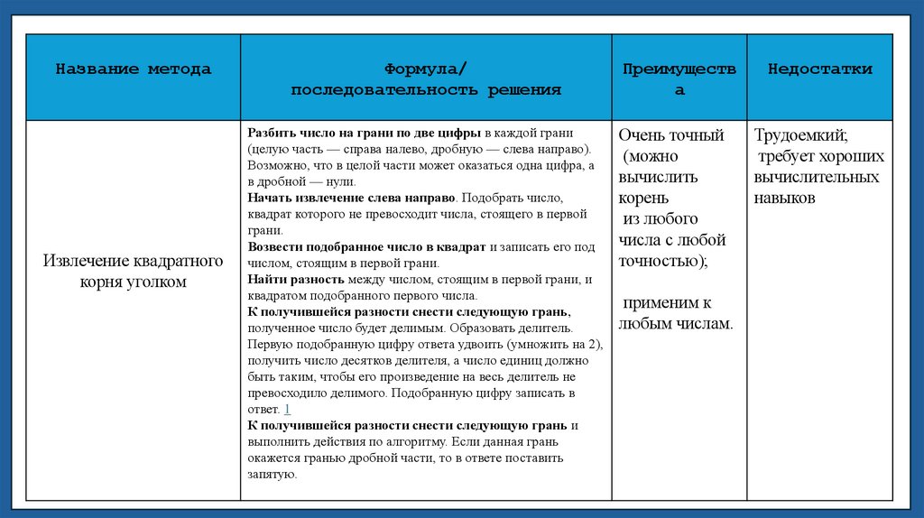 Недостатки - если извлекаемый корень не является целым числом, то можно узнать только его целую