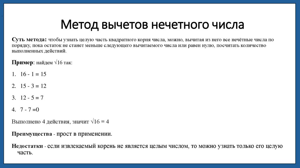Суть метода: чтобы узнать целую часть квадратного корня числа, можно, вычитая из него все нечётные числа по