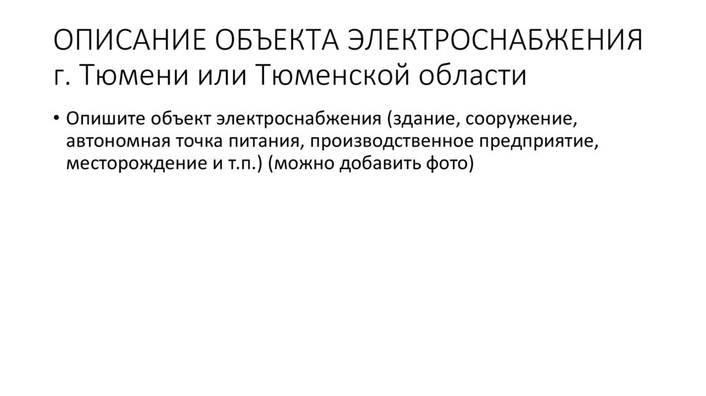 ОПИСАНИЕ ОБЪЕКТА ЭЛЕКТРОСНАБЖЕНИЯг. Тюмени или Тюменской области