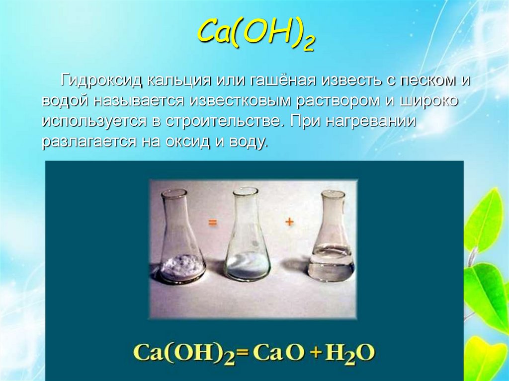 Гидроксид кальция или гашёная известь с песком иводой называется известковым раствором и широко