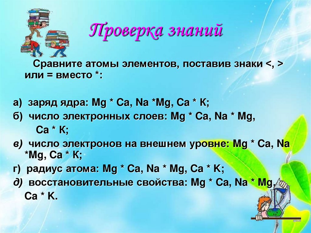 г) радиус атома: Mg * Ca, Na * Mg, Ca * K;