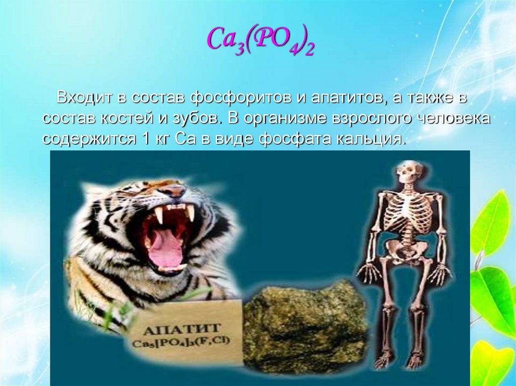 Входит в состав фосфоритов и апатитов, а также всостав костей и зубов. В организме взрослого человека