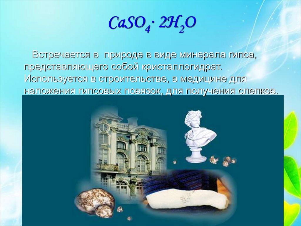 Встречается в природе в виде минерала гипса,представляющего собой кристаллогидрат.