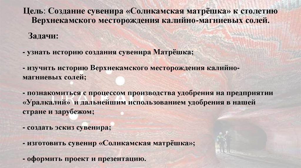 - изучить историю Верхнекамского месторождения калийномагниевых солей;
