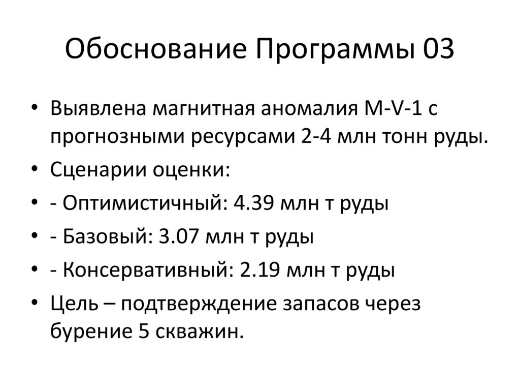 Обоснование Программы 03• Выявлена магнитная аномалия M-V-1 с